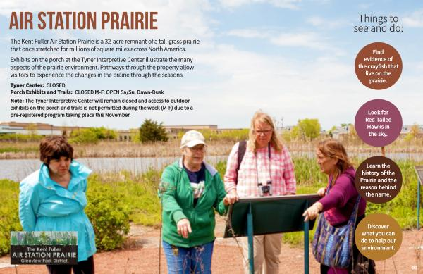 Exhibits on the porch at the Tyner Interpretive Center illustrate the many aspects of the prairie environment . Pathways through the property allow visitors to experience the changes in the prairie through the seasons .