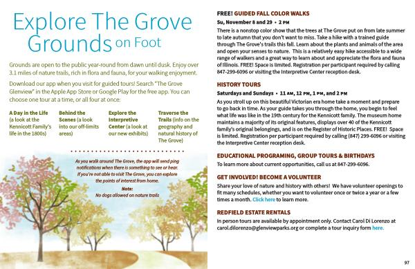 There is a nonstop color show that the trees at The Grove put on from late summer to late autumn that you don ’ t want to miss . Take a hike with a trained guide through The Grove ' s trails this fall . Learn about the plants and animals of the area and open your senses to nature . This is a relatively easy hike accessible to a wide range of walkers and a great way to learn about and appreciate the flora and fauna of Illinois . FREE ! Space is limited . Registration per participant required by calling 847-299-6096 or visiting the Interpretive Center reception desk .