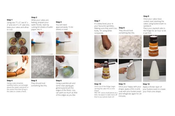 Step 1 Using two 7 ” x 2 ”, two 6 ” x 2 ” and one 5 ” x 4 ” cake tins , bake your cakes and allow to cool .