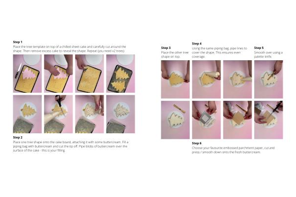 Place the tree template on top of a chilled sheet cake and carefully cut around the shape . Then remove excess cake to reveal the shape . Repeat ( you need x2 trees )