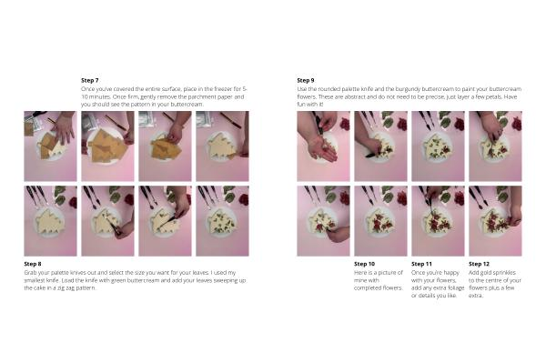 Use the rounded palette knife and the burgundy buttercream to paint your buttercream flowers . These are abstract and do not need to be precise , just layer a few petals . Have fun with it !