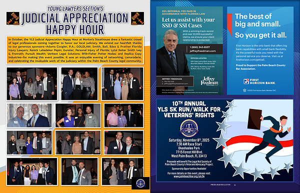 In October, the YLS Judicial Appreciation Happy Hour at Morton’ s Steakhouse drew a fantastic crowd of legal professionals coming together to honor our local judiciary. We extend our heartfelt thanks to our generous sponsors— Adams Coogler, P. A.; GOLDLAW; Smith, Ball, Báez & Prather Florida Injury Lawyers; Xenick Lebedeker Pepin; Gunster; Personal Injury of Florida; Lytal Reiter Smith Ivey & Fronrath; Pursuit Wealth; Veritext Legal Solutions; RFB + Fisher Potter Hodas; and Replica Copy Industries— for making this event possible. It was an enjoyable evening of networking, camaraderie, and celebrating the invaluable work of the judiciary within the Palm Beach County legal community.