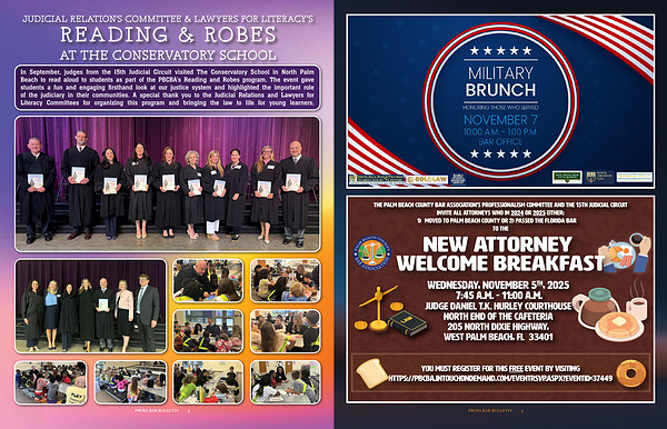 In September, judges from the 15th Judicial Circuit visited The Conservatory School in North Palm Beach to read aloud to students as part of the PBCBA’ s Reading and Robes program. The event gave students a fun and engaging firsthand look at our justice system and highlighted the important role of the judiciary in their communities. A special thank you to the Judicial Relations and Lawyers for Literacy Committees for organizing this program and bringing the law to life for young learners.