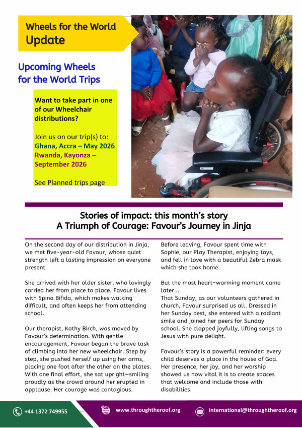 Our therapist, Kathy Birch, was moved by Favour’ s determination. With gentle encouragement, Favour began the brave task of climbing into her new wheelchair. Step by step, she pushed herself up using her arms, placing one foot after the other on the plates. With one final effort, she sat upright— smiling proudly as the crowd around her erupted in applause. Her courage was contagious.