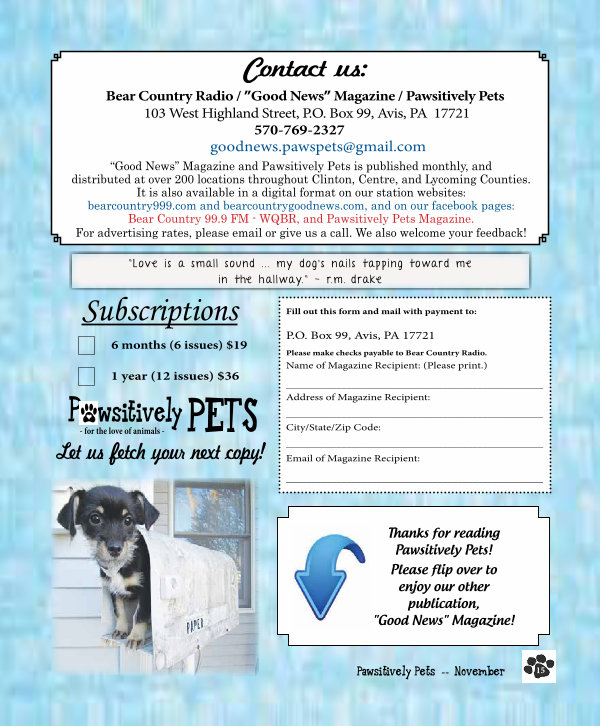 “ Good News” Magazine and Pawsitively Pets is published monthly, and distributed at over 200 locations throughout Clinton, Centre, and Lycoming Counties. It is also available in a digital format on our station websites: bearcountry999. com and bearcountrygoodnews. com, and on our facebook pages: Bear Country 99.9 FM- WQBR, and Pawsitively Pets Magazine. For advertising rates, please email or give us a call. We also welcome your feedback!