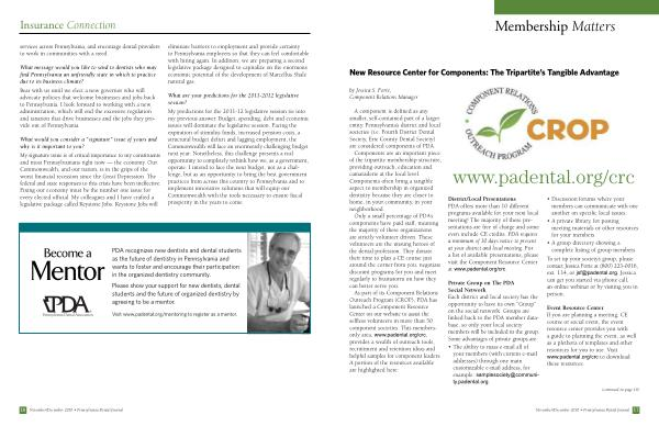 A component is defined as any smaller , self-contained part of a larger entity . Pennsylvania ’ s district and local societies ( i . e . Fourth District Dental Society , Erie County Dental Society ) are considered components of PDA . Components are an important piece of the tripartite membership structure , providing outreach , education and camaraderie at the local level . Components often bring a tangible aspect to membership in organized dentistry because they are closer to home , in your community , in your neighborhood . Only a small percentage of PDA ’ s components have paid staff , meaning the majority of these organizations are strictly volunteer driven . These volunteers are the unsung heroes of the dental profession . They donate their time to plan a CE course just around the corner from you , negotiate discount programs for you and meet regularly to brainstorm on how they can better serve you . As part of its Component Relations Outreach Program ( CROP ), PDA has launched a Component Resource Center on our website to assist the selfless volunteers in more than 50 component societies . This membersonly area , www . padental . org / crc , provides a wealth of outreach tools , recruitment and retention ideas and helpful samples for component leaders . A portion of the resources available are highlighted here : www . padental . org / crc