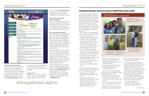 We are very excited to announce the Component Relations Outreach Program ( CROP ) has been selected as a 2010 ADA Golden Apple Award recipient for Excellence in Member- Related Services / Benefits . The program was developed to assist all local societies in their efforts to provide membership benefits to their members , with a specific focus on components that are struggling or no longer in operation . The objectives of the Component Relations Outreach Program include :