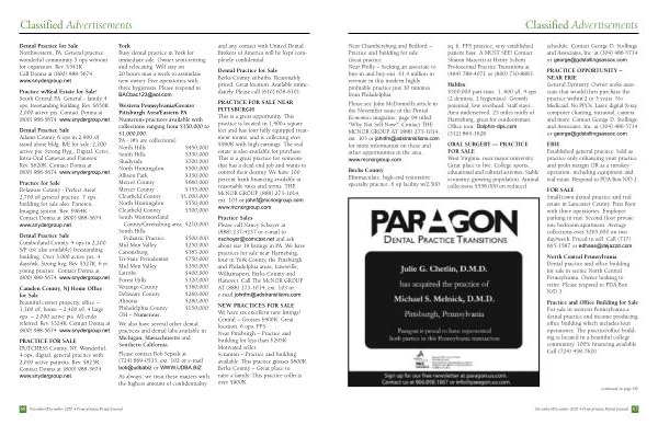 Western Pennsylvania / Greater Pittsburgh Area / Eastern PA Numerous practices available with collections ranging from $ 150,000 to $ 1,000,000 . PA - (#' s are collections ) North Hills $ 450,000 South Hills $ 330,000 Shadyside $ 700,000 North Huntingdon $ 500,000 Allison Park $ 350,000 Mercer County $ 660,000 Mercer County $ 155,000 Clearfield County $ 1,000,000 North Huntingdon $ 550,000 Clearfield County $ 500,000 South Westmoreland County / Greensburg area $ 210,000 South Hills Pediatric Practice $ 500,000 Mid Mon Valley $ 250,000 Canonsburg $ 385,000 Tri-State Periodontist $ 750,000 Mid Mon Valley $ 350,000 Latrobe $ 400,000 Forest Hills $ 320,000 Venango County $ 360,000 Delaware County $ 260,000 Altoona $ 280,000 Philadelphia County $ 150,000 OH – Numerous .