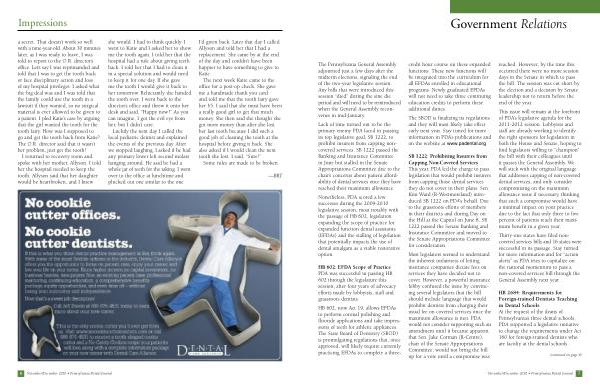 This issue will remain at the forefront of PDA ’ s legislative agenda for the 2011-2012 session . Lobbyists and staff are already working to identify the right sponsors for legislation in both the House and Senate , hoping to find legislators willing to “ champion ” the bill with their colleagues until it passes the General Assembly . We will stick with the original language that addresses capping of non-covered dental services , and only consider compromising on the maximum allowance issue if necessary , thinking that such a compromise would have a minimal impact on your practice due to the fact that only three to five percent of patients reach their maximum benefit in a given year .