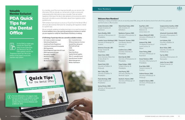 PDA members have exclusive access to our “ Quick Tips for the Dental Office ,” which provide essential information for complying with regulations related to a specific topic .