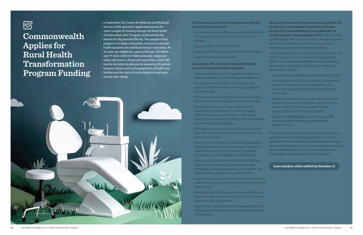 PDA reached out to DHS officials in October to further discuss and refine these ideas before the application to CMS was submitted. We were assured that the application will include a request that funding be used for initiatives aimed at expanding the dental workforce and reducing oral health disparities through access and prevention in rural Pennsylvania.