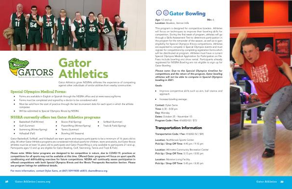 This program is designed for competitive bowlers . Athletes will focus on techniques to improve their bowling skills for competition . During the first week of program , athletes will go through a Skills Assessment Test to determine participation in the program for the remainder of the season , as well as to gain eligibility for Special Olympics Illinois competitions . Athletes are expected to compete in Special Olympics events and must register for competitions by completing registration forms which will be distributed at program . Athletes must have a current Special Olympics Medical Application for Participation on file . Fees include bowling and shoe rental . Participants already registered for NSSRA Bowling are not eligible to sign up for Gator Bowling .
