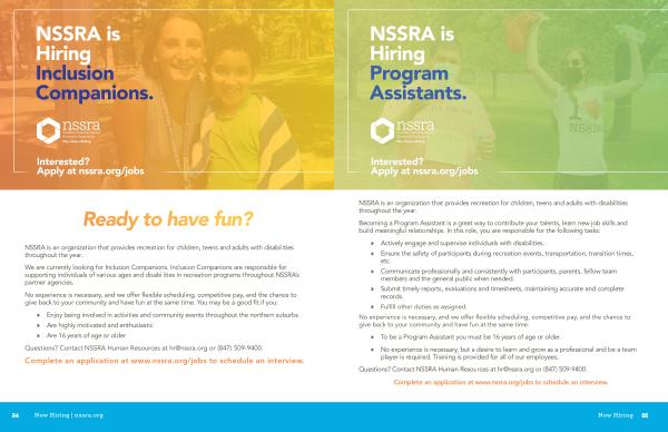 We are currently looking for Inclusion Companions . Inclusion Companions are responsible for supporting individuals of various ages and disabilities in recreation programs throughout NSSRA ’ s partner agencies .