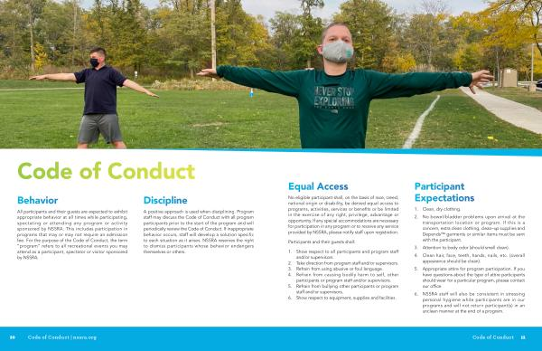A positive approach is used when disciplining . Program staff may discuss the Code of Conduct with all program participants prior to the start of the program and will periodically review the Code of Conduct . If inappropriate behavior occurs , staff will develop a solution specific to each situation as it arises . NSSRA reserves the right to dismiss participants whose behavior endangers themselves or others .