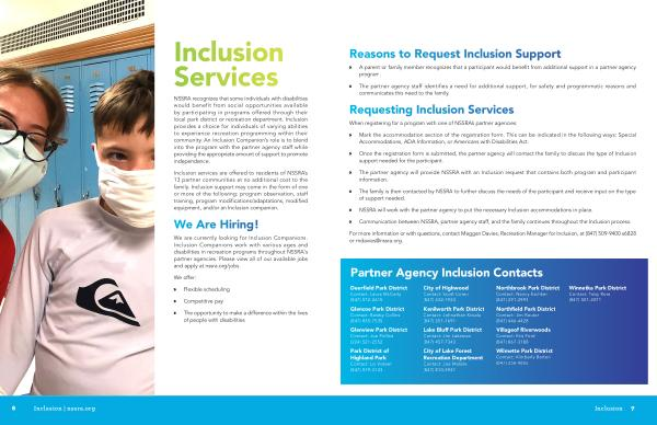 NSSRA recognizes that some individuals with disabilities would benefit from social opportunities available by participating in programs offered through their local park district or recreation department . Inclusion provides a choice for individuals of varying abilities to experience recreation programming within their community . An Inclusion Companion ’ s role is to blend into the program with the partner agency staff while providing the appropriate amount of support to promote independence .