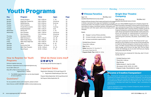 Join your fellow NSSRA thespians for a theatre program for teens and adults interested in acting , performing amongst a cast , and experiencing all that a live stage production has to offer ! Volunteers with a common interest in theatre , known as Creative Companions and Northbrook Park District Theatre staff , will join participants to help facilitate a total production . Actors will develop an understanding of auditioning , character development , stage blocking , choreography , performing with costumes , set pieces , sound effects , and more !