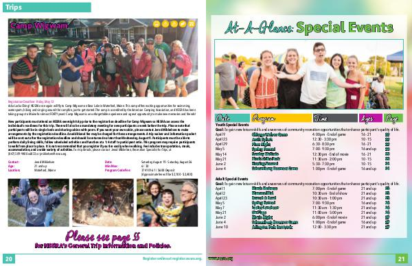 New participants must attend an NSSRA overnight trip prior to the registration deadline for Camp Wigwam so NSSRA can assess the individual’ s readiness for this trip. There will also be a mandatory meeting for new participants a week before the trip. Please note that participants will be in single beds and sharing cabins with peers. If you want your own cabin, please contact Jerod Mikkelsen to make arrangements by the registration deadline. An additional fee may be charged for these arrangements. A trip waiver and information packet will be sent out after the registration deadline and should be returned no later than Wednesday, August 9. Participants must be able to perform daily living skills, follow scheduled activities and function at a 1:4 staff to participant ratio. This program may require participants to walk from place to place. It is not recommended that you register if you tire easily when walking. Fee includes transportation, meals, accommodation, and a wide variety of activities. For trip details, please contact Jerod Mikkelsen, Recreation Specialist for Trips, at( 847) 509-9400 x6833 or jmikkelsen @ nssra. org.