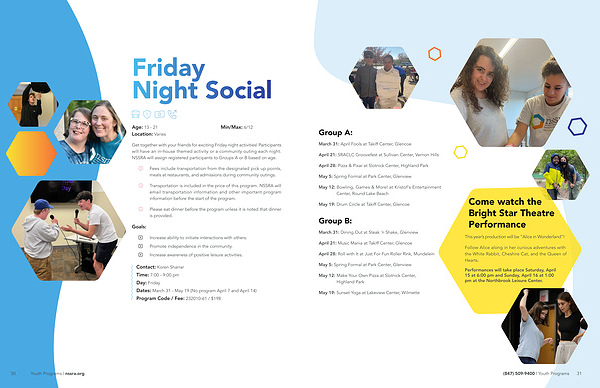 Get together with your friends for exciting Friday night activities ! Participants will have an in-house themed activity or a community outing each night . NSSRA will assign registered participants to Groups A or B based on age .