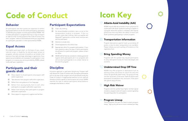 A positive approach is used when disciplining . Program staff may discuss the Code of Conduct with all program participants prior to the start of the program and will periodically review the Code of Conduct . If inappropriate behavior occurs , staff will develop a solution specific to each situation as it arises . NSSRA reserves the right to dismiss participants whose behavior endangers themselves or others .