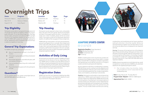 Eligibility : Participants must be able to meet all general trip expectations . NSSRA expects participants to carry out all activities of daily living independently . NSSRA staff will provide minimal guidance or prompting to remind participants of activities of daily living . Participants must be independent for periods where staff supervision and assistance are unavailable , including overnight sleeping , down time , personal care , and hygiene . This trip includes outdoor activities such as skiing , snowboarding , and snowshoeing and will require significant walking for activities in the winter weather . We do not recommend that you register if you tire when hiking or if you do not have the desire to ski or snowboard for the majority of each day .