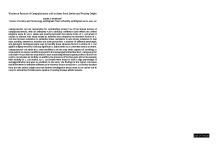 Campylobacter coli are responsible for contributing around 7% of the annual burden of campylobacteriosis, with an estimated 4,500 clinically confirmed cases within the United Kingdom alone in 2012. Swine and poultry represent the natural niche of C. coli where it causes no disease. This study looked at, assessed and compared the virulence factors of C. coli that include; resistance to oxidative stress, resistance to acid stress, resistance to bile salts, motility, adherence, Invasion and toxin production. A number of different phenotypic and genotypic techniques were used to identify these virulence factors in strains of C. coli against a highly invasive, clinically significant C. jejuni strain 01/51 that was used as a control. Campylobacter coli strain B7/1 was identified to be the only strain capable of surviving, to some extent, at low pH conditions present in the human gastrointestinal tract. Campylobacter coli strain 94/208 was the only strain to have a matching virulence gene profile to that of the control, but showed no motility. In addition, the presence of the flaA gene did not necessarily infer motility in C. coli strains. All C. coli strains were found to have a high percentage of autoagglutination and were all resistant to bile salts. The findings in this report concluded that there were no definitive differences in virulence factors across the C. coli strains isolated from the two animal origins and that further investigation would need to be carried out in order to determine if strains were capable of causing disease within humans.