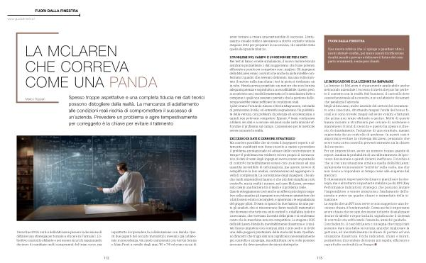 I PROBLEMI SUL CAMPO E L’ OSSESSIONE PER I DATI Nei test al banco e nelle simulazioni, il nuovo motore Honda sembrava promettente: i dati suggerivano che fosse potente, efficiente e pronto per competere con i migliori. Gli ingegneri della McLaren erano convinti che anche la pista avrebbe confermato il quadro che avevano delineato, ma una volta montato il motore nella macchina i test in pista si rivelarono un incubo. Honda aveva progettato un motore che non forniva adeguata potenza e soprattutto non era affidabile. Questo, però, si scontrava con i modelli matematici e le simulazioni fatte a computer, i quali non avevano previsto che la gestione dell’ e- nergia sarebbe stata inefficace in condizioni reali. I piloti erano Fernando Alonso e Kevin Magnussen, entrambi di primissimo livello, ed entrambi segnalavano l’ inguidabilità della vettura, con problemi di potenza ed accelerazione, e quindi non potevano competere. Eppure, il team continuava a fidarsi dei dati e a cercare soluzioni sulla carta anziché affrontare il problema sul campo. L’ ossessione per le metriche aveva oscurato la realtà.
