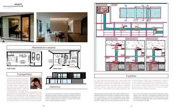 Nel caso degli scorrevoli e delle vetrate fisse( 2835x1775 mm, 2835x3190 mm) la vetrocamera è composta da vetro esterno 55.4, 15 gas argon w. e. nero, 8 b. e. temperato, 14 gas argon w. e. nero, 55.2 acustico b. e.( Ug = 0,8W / m 2 K, Uwmedio = 1,0W / m 2 K, RW = 49dB) che in alcune posizioni è invece 44.2 pho- ne b. e. per non superare il peso massimo dell’ anta. I serramenti a una o due ante a scomparsa di altezza 2534 mm e larghezza di varie misure( da 634 a 1823 mm) sono stati installati in monoblocchi isolati con avvolgibili motorizzati con certificazione RC4.