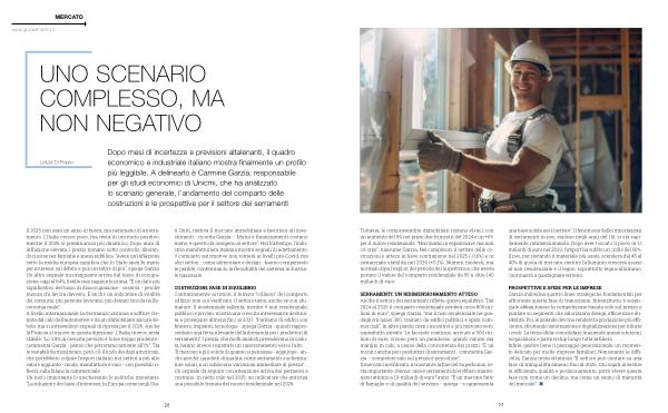 COSTRUZIONI: FASE DI EQUILIBRIO Contrariamente ai timori, il temuto“ collasso” del comparto edilizio non si è verificato. Il settore tiene, anche se con sfumature. Il residenziale rallenta, mentre il non residenziale, pubblico e privato, mostra una crescita interessante destinata a proseguire almeno fino al 2027.“ Parliamo di edifici con finestre, impianti, tecnologie- spiega Garzia- quindi rappresentano una fetta rilevante della domanda per i produttori di serramenti”. I prezzi, che molti analisti prevedevano in caduta, hanno invece registrato un riassestamento verso l’ alto.“ Il mercato è più solido di quanto si pensasse- aggiunge- anche perché i prodotti di qualità, come serramenti o schermature solari, non subiscono variazioni immediate di prezzo”. Un segnale da seguire con attenzione arriva dai permessi a costruire, in netto calo nel 2025: un indicatore che anticipa una possibile frenata del nuovo residenziale nel 2026.
