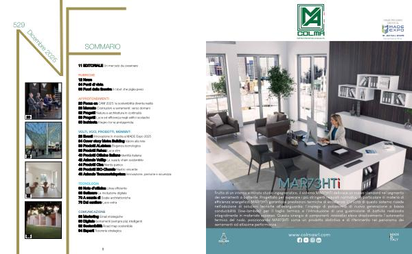 VOLTI, VOCI, PRODOTTI, MOMENTI 28 Eventi Innovazione in mostra a MADE Expo 2025 34 Cover story Metra Building Valore alla rete 36 Prodotti ALsistem Eleganza tecnologica 38 Prodotti Rehau Luce slim 40 Prodotti Officine Italiane Identità italiana 42 Aziende Voilàp La supply chain sostenibile 44 Prodotti Cisa Niente panico 46 Prodotti ISO-Chemie Nastro vincente 48 Aziende Tecnometalsystem Innovazione, persone e sicurezza