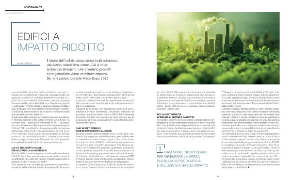 LCA: LO STRUMENTO CHIAVE PER VALUTARE LA SOSTENIBILITÀ Al centro della transizione green si conferma la metodologia LCA( Life Cycle Assessment), oggi considerata lo strumento più affidabile e normato per valutare l’ impatto ambientale di materiali, edifici e sistemi costruttivi.“ LCA permette una valutazione quantitativa, oggettiva e completa, dalla culla alla tomba”, ha spiegato Erba, richiamando il quadro normativo che ne definisce l’ applicazione: EN 15804 per i prodotti da costruzione, EN 15978 per gli edifici e ISO 14040 come riferimento metodologico. A queste si affianca Level( s), la piattaforma europea che offre una versione semplificata degli indicatori ambientali e prestazionali. I risultati di un’ analisi LCA confluiscono nelle EPD( Environmental Product Declaration), documenti verificati che riportano indicatori chiave come il GWP( Global Warming Potential). Un dato che acquista un ruolo centrale anche nella nuova direttiva europea EPBD4 e negli attestati di prestazione energetica.