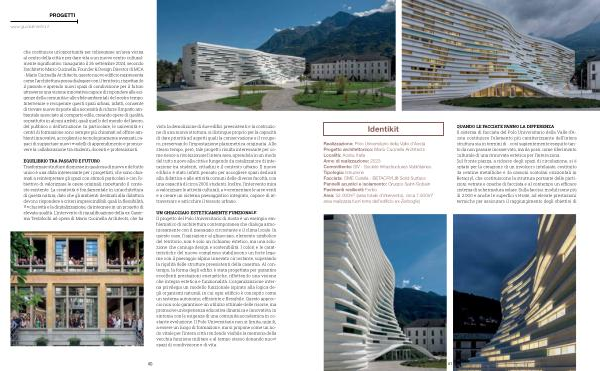Realizzazione : Polo Universitario della Valle d ’ Aosta Progetto architettonico : Mario Cucinella Architects Località : Aosta , Italia Anno di realizzazione : 2023 Committente : SIV - Société Infrastructures Valdôtaines Tipologia : Istruzione Facciata : OME Catella - BETACRYL ® Solid Surface Pannelli acustici e isolamento : Gruppo Saint-Gobain Pavimenti resilienti : Forbo Area : 52.000m 2 ( area totale d ’ intervento ), circa 7.500m 2 area realizzata fuori terra dell ’ edificio ex-Zerboglio )