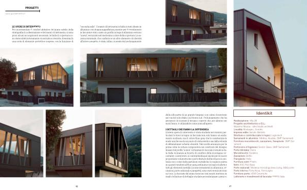 Realizzazione : Villa 2B Progetto architettonico e D . L .: Massimo Mescia - altro / studio architetti Località : Morbegno , Sondrio Impresa edile : Sandro Bertolini Strutture e controfacciate in legno : Legnotech Serramenti in alluminio : Miniline , Aluslide , SMP Serramenti Fornitura monoblocchi , zanzariere , frangisole : SMP Serramenti Portoncino d ’ ingresso : Sividor Glass , SMP Serramenti Porta blindata : Dierre Monoblocchi : Durabloc Zanzariere : Bettio Frangisole : Hella Fornitura vetri : BVetro Vetri : AGC Flat Glass Porte sezionali : Modena monodoga linea Living , BBG porte Porte interne : Porta Nova , FerroLegno Fornitura porte : VDM Ceramiche Lattonerie e rivestimenti di facciata : PREFA Italia