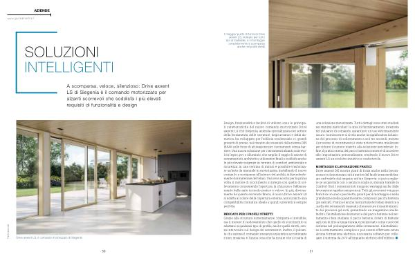 Design , funzionalità e facilità di utilizzo sono le principali caratteristiche del nuovo comando motorizzato Drive axxent LS che Siegenia , azienda specializzata nel settore della ferramenta , delle serrature , degli aeratori e della domotica , ha sviluppato per l ’ edilizia residenziale e i grandi progetti di pregio , nel rispetto dei requisiti della norma DIN 18040 sulle forze di attivazione per i serramenti senza barriere . Una nuova soluzione per i serramenti alzanti scorrevoli in legno , pvc o alluminio , che amplia il raggio di azione di serramentisti , architetti e utilizzatori finali e soddisfa anche le più elevate esigenze in termini di comfort ambientale e sicurezza : in una ventina di minuti è possibile trasformare un ’ anta da manuale in motorizzata , installando il nuovo comando a scomparsa all ’ interno del profilo , indipendentemente dal materiale del telaio . Una vera novità : per la prima volta , il motore di scorrimento si integra con quello di sollevamento consentendo l ’ apertura , la chiusura e l ’ abbassamento delle ante in modo pratico e veloce . In più , diversamente da quanto avvenuto finora , il nuovo Drive axxent LS si adatta al colore della copertura esterna , assicurando una compatibilità cromatica ideale e quindi un ’ estetica sempre perfetta .