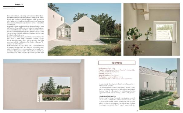 intonaci rurali- diventa tratto distintivo dell’ architettura e delle opere dell’ artista. L’ accesso avviene attraverso un volume in acciaio e vetro, che richiama i giardini d’ inverno delle ville di delizia agresti, e che funge da collegamento tra l’ abitazione e l’ atelier; il quarto volume di servizio si trova a ridosso della piscina.