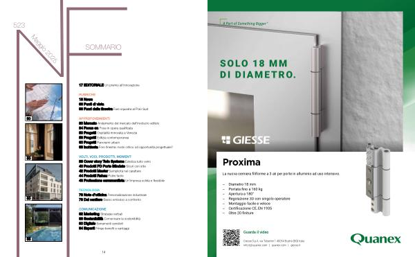 APPROFONDIMENTI 30 Mercato Andamento del mercato dell’ involucro edilizio 34 Focus on Posa in opera qualificata 50 Progetti Ospitalità rinnovata a Venezia 56 Progetti Edilizia contemporanea 60 Progetti Panorami urbani 68 Inchiesta Foro finestra: nodo critico od opportunità progettuale?