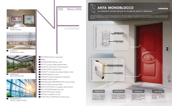 19 EDITORIALE Scenari e opportunità 20 NEWS 28 OSSERVATORIO Ripresa in vista? 38 EVENTI L’ involucro edilizio guarda all’ estero 44 INCENTIVI Conto termico 3.0 per serramenti 46 COVER STORY Continuità visiva 48 PRODOTTI La finestra che interpreta l’ edilizia circolare 50 AZIENDE Espansione in atto 52 PRODOTTI Soluzioni integrate per il rivestimento 54 AZIENDE Finestre evolute 56 PROFESSIONE SERRAMENTISTA Il tempo del legno 72 PUNTI DI VISTA Casa sullo stagno 78 NOTE D’ OFFICINA Un solo gruppo, infinite soluzioni 80 DAL CANTIERE Progetto fuori scala 86 MARKETING Dialogo costruttivo 90 DIGITALE Configurare con l’ AR 96 FUORI DALLA FINESTRA Le finestre di osso