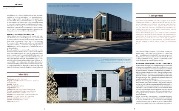 Realizzazione: edificio direzionale Progetto architettonico: Remo Capitanio- Studio Capitanio Architetti Località: Bergamo Anno di realizzazione: 2022 Progettazione: 2020 Committente: Mazzoleni Trafilerie Bergamasche Facciate prefabbricate in c. a.: Magnetti Building Serramenti e facciate ventilare: Kreal- Metra Strutture: Sergio Myallonnier- Myallonnier Ingegneria Strutture: Enrico Zambonelli- MCZ Ingegneria Impresa costruttrice: Impresa Colosio Strutture in acciaio: Fratelli Gelmini Superficie: 1.000 m 2