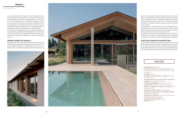 Realizzazione: villa privata Progetto architettonico e direzione lavori: arch. Andrea Gerosa e ing. arch. Franco Gerosa- Studio Gerosa Località: Brianza Progetto impianti elettrici e speciali: Luca Gaffuri- Studio Tcl Progetto impianti meccanici, idrico sanitari ed energia: Ernesto Galli- Studio Citi Progetto paesaggistico: arch. Valerio Cozzi Lavori edili: Impresa di Costruzioni F. lli Gerosa Opere in carpenteria metallica su disegno: CM Carpenteria; PRK Oscuranti e tende esterne: Model System Serramenti, rivestimenti e controsoffitti in legno: Falegnameria Menaballi Serramenti in alluminio: Schüco, Bove Serramenti Fornitore vetri: Mornagoglass Ferramenta antieffrazione: AGB Maniglie: Olivari