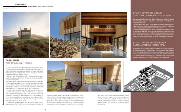 “ In questo progetto la parte vetrata, in antitesi con le regole statiche più comuni, sostiene il volume opaco. In questo modo l’ impiego della pietra naturale locale assume un senso metafisico in quanto negazione e al contempo esaltazione della sua matericità. Per mettere in atto questo concetto fondamentale è stato l’ impiego di serramenti resistenti sia al peso strutturale, sia ai forti venti della zona”. ta di legno. La sostenibilità è fondamentale: energia solare, riciclo dell’ acqua e minima interferenza territoriale per preservare la flora e la fauna autoctona.