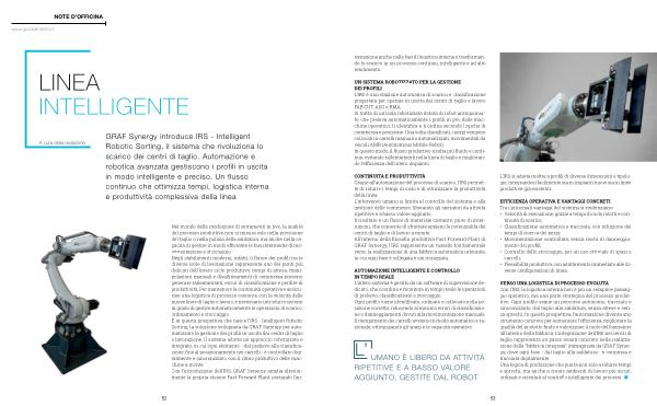 CONTINUITÀ E PRODUTTIVITÀ Grazie all’ automazione del processo di scarico, l’ IRS permette di ridurre i tempi di ciclo e di ottimizzare la produttività della linea. L’ intervento umano si limita al controllo del sistema e alla gestione delle commesse, liberando gli operatori da attività ripetitive e a basso valore aggiunto. Il risultato è un flusso di materiale costante, privo di interruzioni, che consente di sfruttare appieno le potenzialità dei centri di taglio e di lavoro a monte. All’ interno della filosofia produttiva Fast Forward Plant di GRAF Synergy, l’ IRS rappresenta un tassello fondamentale verso la realizzazione di una fabbrica automatica integrata, in cui ogni fase è collegata e sincronizzata.