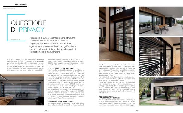 più efficaci nel controllo dell’ irraggiamento nelle ore critiche. Più la lamella è grande, infatti, e meglio infrangerà i raggi solari alla mattina e alla sera quando l’ angolo del sole è più elevato. Un frangisole orientabile risponde anche a una richiesta tipica dei clienti:“ Vorremmo dei vetri che non permettano di vedere dentro, ma che ci consentano di guardare fuori.” Con il frangisole a lamelle orientabili, questa esigenza è realizzabile in modo efficace, offrendo privacy e comfort visivo senza rinunciare alla luminosità. È bene però chiarire ai clienti che l’ oscuramento totale non è realizzabile con questi sistemi: rimarrà sempre un passaggio di luce indiretta tra lamelle e guide, dell’ ordine di 5-10 mm per lato. Per i clienti esigenti che vogliono dormire in“ camere oscure”, si può consigliare l’ abbinamento con tende interne oscuranti solo nelle camere da letto interessate.