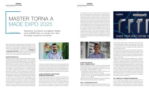 ri Easy Block e agli accessori dedicati alla Linea Porte. Non mancherà Karma, la collezione che comprende cremonesi, martelline, maniglie disassate, doppie maniglie e maniglioni di design, proposta anche in versione minimale per interpretare al meglio le esigenze del mercato contemporaneo dei serramenti. Accanto a queste soluzioni presenteremo anche prodotti dedicati alle aperture speciali e alle grandi specchiature: dalla linea Tuttavista per scorrevoli minimali alla Linea As per alzanti scorrevoli, dalle soluzioni Toplflex per aperture a libro alla gamma di accessori per scorrevoli in linea ad alte prestazioni”, dichiara Lorenzo Lafronza, Technical and BU OEM Director di Master.“ A MADE Expo avremo inoltre un’ area interamente dedicata a MasterLAB, il nostro centro ricerca e sviluppo con laboratorio prove. Qui i visitatori potranno confrontarsi con i nostri tecnici, seguire dal vivo le fasi di montaggio dei prodotti ed esplorare le più moderne tecnologie di stampa 3D”, aggiunge Lafronza.