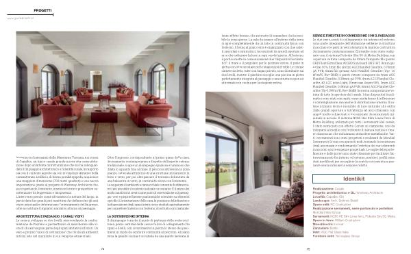 SERRE E FINESTRE IN CONNESSIONE CON IL PAESAGGIO Le due serre, ponti di collegamento tra interno ed esterno, sono parte integrante dell’ abitazione sebbene la struttura in acciaio e le parti in vetro denotino la matrice costruttiva decisamente contemporanea. Entrambe sono state realizzate con il sistema Poliedra Sky 50 di Metra Building con copertura vetrata composta da 10mm Temprato filo grezzo GRD Float ExtraClear, # 2GRD SunGuard SN 51 HT, 16mm gas Argon 90 %, 6mm filo grezzo AGC Planibel Clearlite, 0.76mm gA PVB, 6mm filo grezzo | AGC Planibel Clearlite( Ug = 1.0 W / m ² K, Rw = 38dB) e pareti vetrate composte da 4mm AGC Planibel Clearlite, 0.38mm gA PVB, 4mm AGC Planibel Clearlite, # 2 AGC iplus Light, 15mm gas Argon 90 %. 3mm AGC Planibel Clearlite, 0.38mm gA PVB, 3mm | AGC Planibel Clearlite( Ug = 1.0W / m ² K, Rw = 38dB) la stessa composizione vetrata di tutte le aperture del casale. I due dispositivi bioclimatici sono stati concepiti come piattaforme di riflessione e contemplazione, ma anche di distribuzione interna. Il salone al piano terra è inondato di luce naturale che entra dalle grandi aperture a tutt’ altezza ad arco ribassato con angoli molto schiacciati e incorniciate da serramenti minimali in acciaio. Il sistema NC65 Hes Slim Linea Ferro di Metra Building, utilizzato per tutti i serramenti del casale, è stato verniciato con effetto Corten su campione, così da integrarsi al meglio con l’ esistente di natura rustica e creare chiaroscuri che richiamano atmosfere metafisiche. Tutti i serramenti sono stati progettati e realizzati da Mondial Serramenti Group con appositi nodi, testando la resistenza degli ancoraggi e conformando l’ estetica dei vari elementi in accordo con le esigenze progettuali. Le soglie delle portefinestre e delle porte sono state ribassate per facilitare l’ attraversamento fra interno ed esterno, mentre i profili sono stati modificati per accogliere la scatola con serratura passante senza inficiare la sezione ridotta.