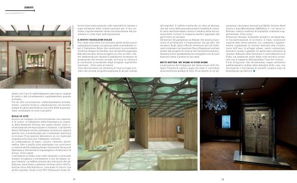 del marchio, il soffitto traslucido in vetro di Murano che nel corso della giornata muta di tonalità di colore. Di vetro ma frantumato ovvero il residuo della lavorazione detto“ cotisso” è composto anche l’ aggregato del pavimento in terrazzo. All’ interno del padiglione un filmato che mostra il processo di produzione e l’ esposizione, fra gli altri, del recupero degli spazi a Beirut attraverso piccoli interventi strategici nel quartiere Bourj Hammoud, portato avanti dal progetto di ricerca che l’ architetta armenolibanese Arine Aprahamian ha sviluppato con la tutor francese Anne Lacaton in due anni.