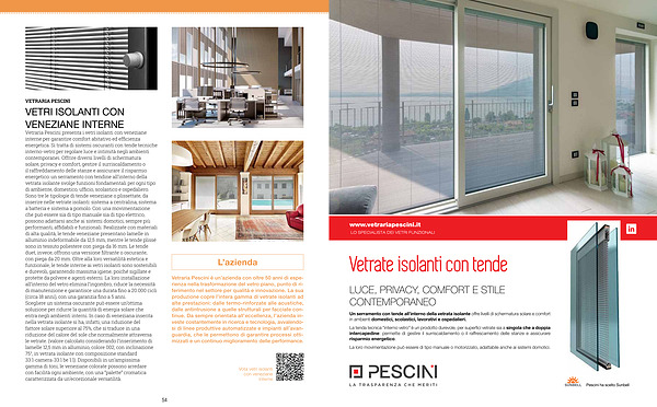 Vetraria Pescini presenta i vetri isolanti con veneziane interne per garantire comfort abitativo ed efficienza energetica. Si tratta di sistemi oscuranti con tende tecniche interno-vetro per regolare luce e intimità negli ambienti contemporanei. Offrire diversi livelli di schermatura solare, privacy e comfort, gestire il surriscaldamento o il raffreddamento delle stanze e assicurare il risparmio energetico: un serramento con tendine all’ interno della vetrata isolante svolge funzioni fondamentali per ogni tipo di ambiente, domestico, ufficio, scolastico e ospedaliero. Sono tre le tipologie di tende veneziane o plissettate, da inserire nelle vetrate isolanti: sistema a centralina, sistema a batteria e sistema a pomolo. Con una movimentazione che può essere sia di tipo manuale sia di tipo elettrico, possono adattarsi anche ai sistemi domotici, sempre più performanti, affidabili e funzionali. Realizzate con materiali di alta qualità, le tende veneziane presentano lamelle in alluminio indeformabile da 12,5 mm, mentre le tende plissé sono in tessuto poliestere con piega da 16 mm. Le tende duet, invece, offrono una versione filtrante o oscurante, con piega da 20 mm. Oltre alla loro versatilità estetica e funzionale, le tende interne ai vetri isolanti sono sostenibili e durevoli, garantendo massima igiene, poiché sigillate e protette da polvere e agenti esterni. La loro installazione all’ interno del vetro elimina l’ ingombro, riduce la necessità di manutenzione e garantisce una durata fino a 20.000 cicli( circa 18 anni), con una garanzia fino a 5 anni. Scegliere un sistema oscurante può essere un’ ottima soluzione per ridurre la quantità di energia solare che entra negli ambienti interni. In caso di veneziana inserita nella vetrata isolante si ha, infatti, una riduzione del fattore solare superiore al 75 %, che si traduce in una riduzione del calore del sole che normalmente attraversa le vetrate.( valore calcolato considerando l’ inserimento di lamelle 12,5 mm in alluminio, colore 002, con inclinazione 75 °, in vetrata isolante con composizione standard 33.1-camera-33.1 be 1.1). Disponibili in un’ ampissima gamma di toni, le veneziane colorate possono arredare con facilità ogni ambiente, con una“ palette” cromatica caratterizzata da un’ eccezionale versatilità.