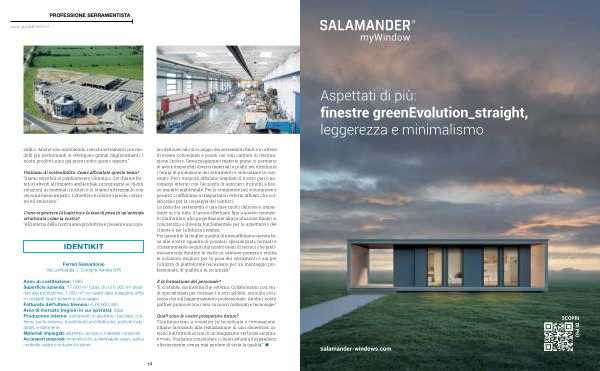 Anno di costituzione: 1985 Superficie azienda: 17.000 m ² totali, di cui 6.000 m ² destinati alla produzione, 1.000 m 2 occupati dalla palazzina uffici e i restanti spazi esterni e stoccaggio Fatturato dell’ ultimo triennio: € 24.600.000 Area di mercato( regioni in cui operate): Italia Produzione interna: serramenti in alluminio, facciate continue, porte interne, rivestimenti architettonici, portoni industriali, e lattonerie Materiali impiegati: alluminio, acciaio e materiali compositi Accessori proposti: monoblocchi, schermature solari, vetri a controllo solare e soluzioni custom