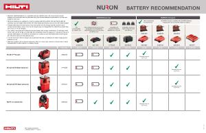 • While ALL NURON batteries are compatible with ALL NURON tools, Hilti recommends specific batteries to be sold with each tool because they offer the best balance of performance, run time and weight for each tool.*