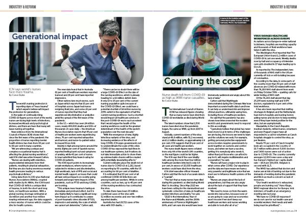 Using data from its 130-plus National Nurses Associations ( NNAs ), coupled with studies by its NNAs , the ICN found that COVID-19 inflicts a unique kind of trauma , in both the short and long term , on healthcare workers . With a global nursing shortage estimated at six million and another four million nearing retirement age , the data suggests a mass exodus of nurses which could be dire for health systems .