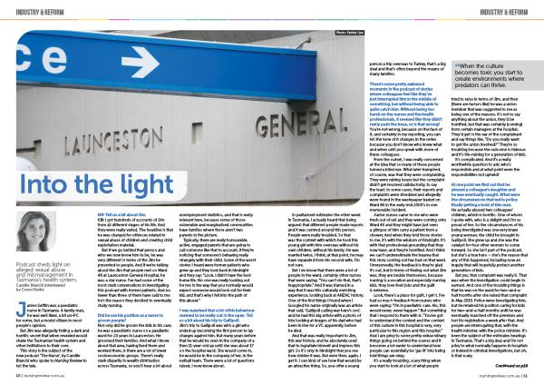 But yes , that complaint was really it . That was when the investigation could begin in earnest . And one of the troubling things is that he was on the ward for two-and-ahalf months after she raised that complaint in May 2019 . Police were investigating him , but he retained his position caring for kids for two-and-a-half months until he was eventually marched off the premises and lost his registration a week after that . And people are interrogating that , with the health minister , with the police minister . It ’ s been the subject of the estimates hearings in Tasmania . That ’ s a big deal and I ’ m not privy to what normally happens in hospitals or indeed in criminal investigations , but oh , is that scary .