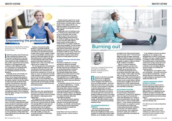 A HEALTH HAZARD WE CANNOT AFFORD TO IGNORE Burnout in nurses has been shown to increase with greater patient loads and to be associated with an intention to leave their job within the next year . [ xii ] With predictions of a significant nursing workforce shortage in Australia in the coming years , this is an issue that requires our focused attention and action at many levels . [ xiii ]